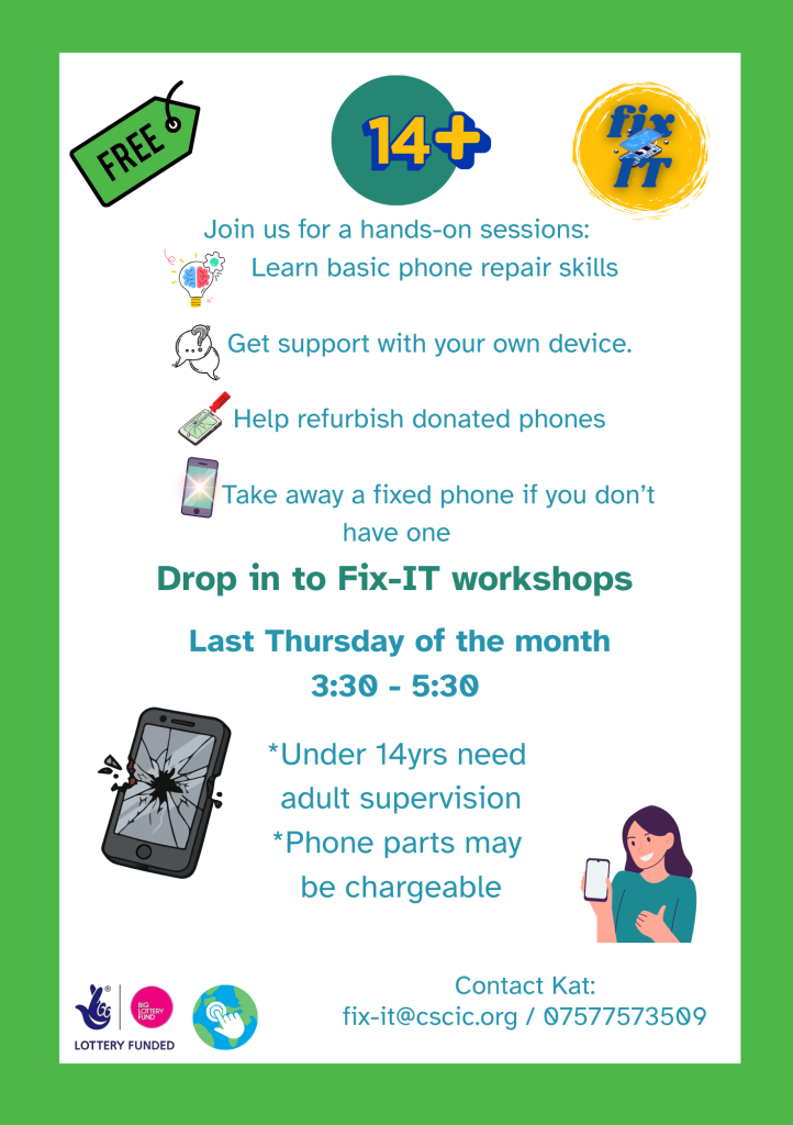 Next week we are launching our drop-in workshops for young people 14+ where you can get free support in making repairs. We have been donated old phones which you can practice on, or even fix one up to keep if you don’t have your own. Or use our tools to fix your own phone.